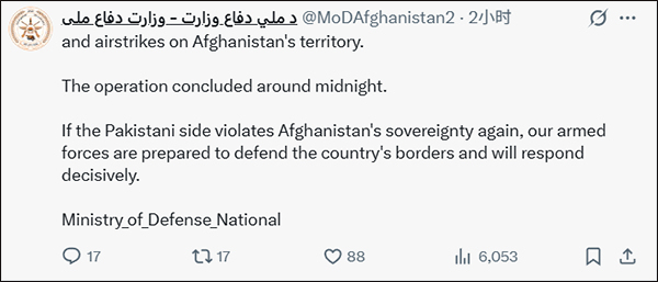 此外,阿富汗国防部也在X平台上发表了近似声明,重申这次热切是针对巴基斯坦“侵扰阿富汗领空”的瑕疵当作。