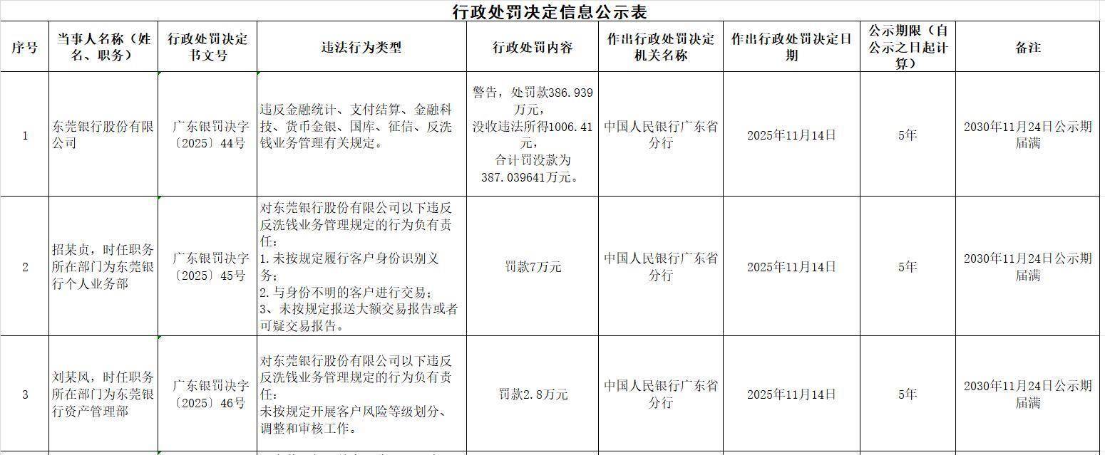 广东银罚决字〔2025〕44号泄露,东莞银行股份有限公司违背金融统计、支付结算、金融科技、货币金银、国库、征信、反洗钱业务解决关系法规。中国东谈主民银行广东省分行对其警戒,处罚金386.939万元,充公积恶所得1006.41元,共计罚没款为387.039641万元。