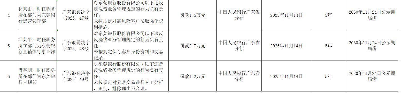 广东银罚决字〔2025〕49号泄露,肖某明(时任职务方位部门为东莞银行合规部)被罚金1.2万元。