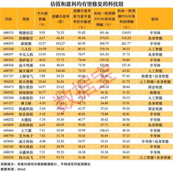 齐集机构不雅点及一致预测数据,上述五大科技范畴中,24 家公司有望完了估值与盈利双重设立。筛选条目包括:2026 年预测市盈率(恰恰,下称前瞻市盈率)较刻下编削市盈率折价超 30%;机构一致预测 2025 年、2026 年净利润增幅均超 30%(含 2025 年有望扭亏为盈的公司);年内涨幅低于 16%(跑输上证指数)。