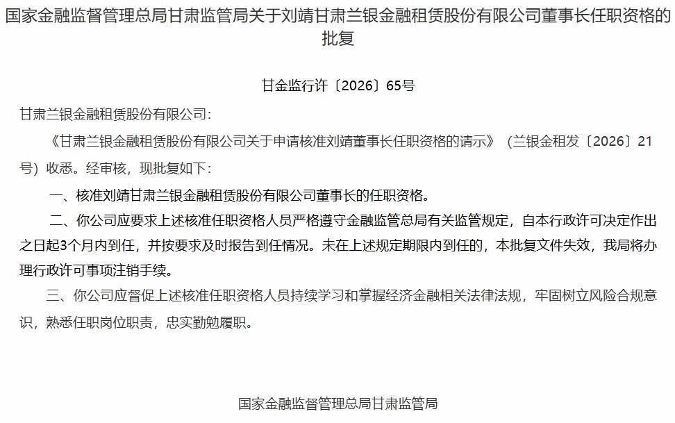 近日世博shibo登录入口,国度金融监督处治总局甘肃监管局发布行政许可批复(甘金监行许〔2026〕65号),讲求核准刘靖甘肃兰银金融租借股份有限公司董事长的任职履历。