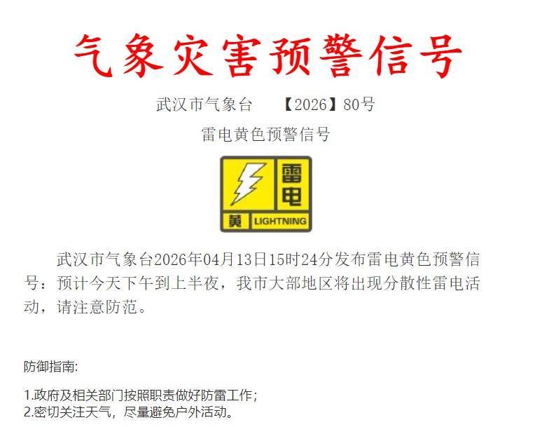 湖北日报讯(记者汤炜玮、通信员高琪清)武汉市气候台4月13日15时24分发布雷电黄色预警信号:预测今天下昼到上更阑,武汉市大部地区将出现漫衍性雷电步履,请细心翔实。