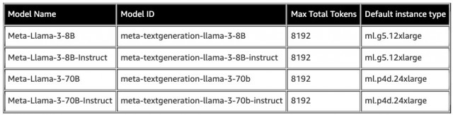 咫尺,SageMaker JumpStart 中可用的统统 Llama 3 模子,以及每个模子维持的默许实例类型和最大总token数如下: