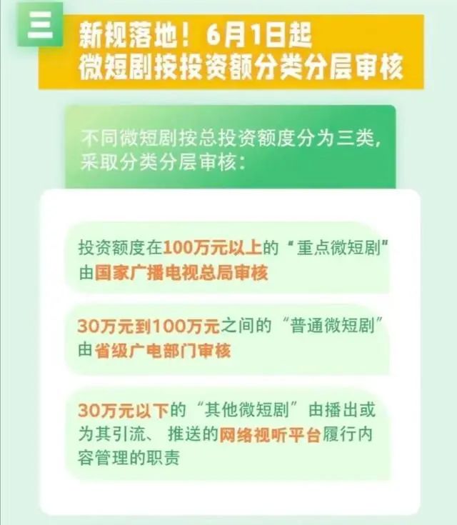 在本色审核方面,《对于微短剧备案最新职责辅导》条款,微短剧按照总投资额度被分为三类,禁受分类分层审核。