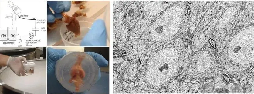 2015年,好意思国脑保护基金会资助的21世纪医学实验室进行了一项对于兔子的实验。他们对兔子实践了完整的醛踏实冷冻保存手术,具体操作是:先用戊二醛灌输活体兔的颈动脉来固定兔脑,然后在几个小时内缓缓灌输浓度约束增多的乙二醇,终末将其在-135℃下冷冻。当冰冻的大脑被再行加热解冻后,参议东谈主员通过不雅察大脑切片发现,大脑的结构保存得异常完整,突触明显可见,神经细胞基本莫得受到毁伤。