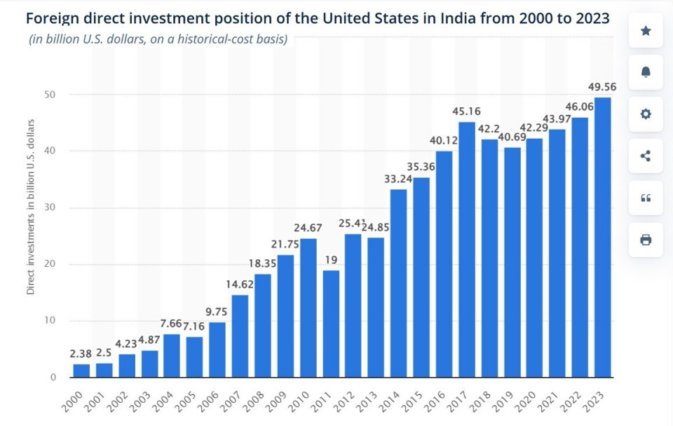 2023年,好意思国对印度径直投资达到495.6亿好意思元,比10年前的248.5亿好意思元翻了一倍,年均增长7.15%。按照前10年的平均增长水平,2030年,好意思国对印度的年度径直投资可达到700亿好意思元的水平。这将有劲推动印度的产业升级和经济增长,诚然,这亦然好意思印商业增长的迫切开首。